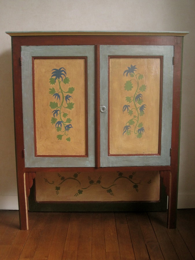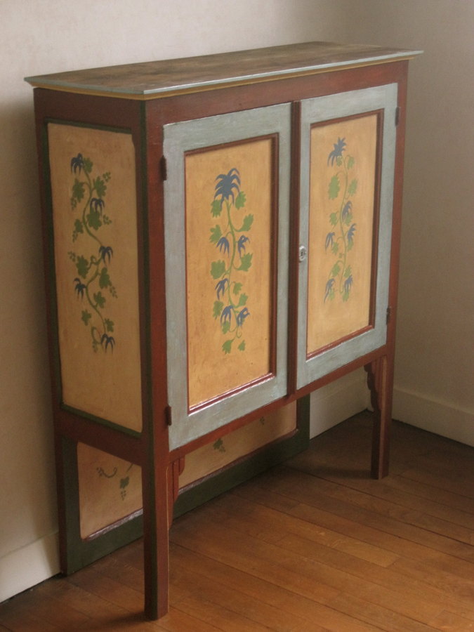 Ancien meuble-buffet peint à la main restauré et décoré à la peinture à la caseine et à l'huile, moyennant l'emploi de peintures écologiques et non toxiques (marque Kreidezeit).