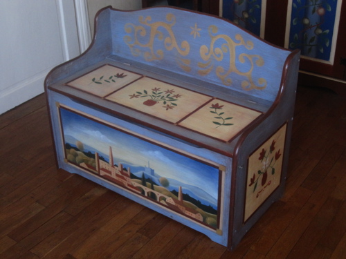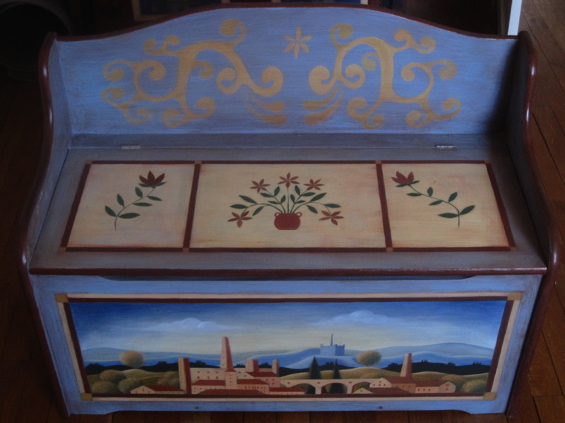 Coffre décoré et peint à la main, style provençal campagne, couleurs et produits naturels (marque Kreidezeit). Apprêt à la caseine, couleurs de base à l'oeuf, décoration et paysage: peinture à l'huile de lin, finition: vernis écologique A+.