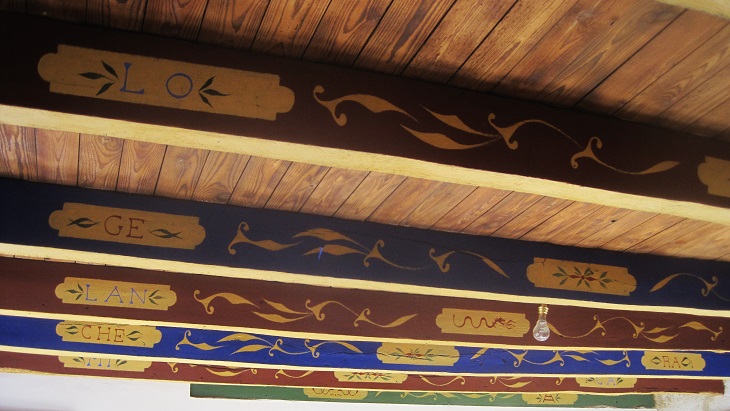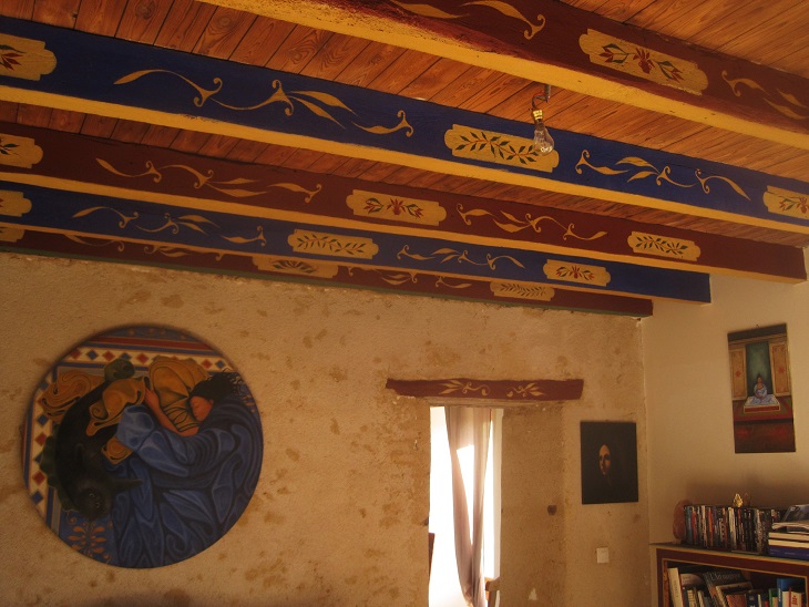 Poutres en bois décorées à la main. La décoration de poutres en bois a été réalisée avec des couleurs écologiques notamment les pigments naturels et à travers l'utilisation d'une prémière couche d'enduit à la caséine. Tous les motifs décoratifs ont été peints à la main. Mon atélier est visible à Chazelet (Indre).