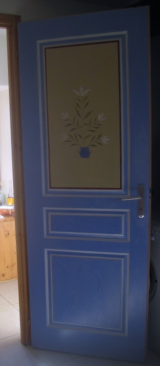 Porte décorée à la peinture à la caseine et à l'huile de lin, moyennant l'emploi de peintures écologiques et non toxiques (marque Kreidezeit), couleur bleu - blanc, motif floral peint à la main.